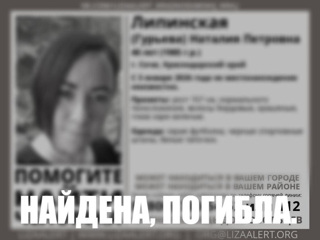 После продолжительных поисков, длившихся свыше месяца, в лесопарковой зоне микрорайона Кудепста в Сочи было обнаружено тело 40-летней Наталии Липинской. Мать четверых детей ушла из своего дома 3 января, после чего связь с ней прервалась. Активные поиски с участием родных, добровольцев и правоохранительных органов велись по всему городу.
