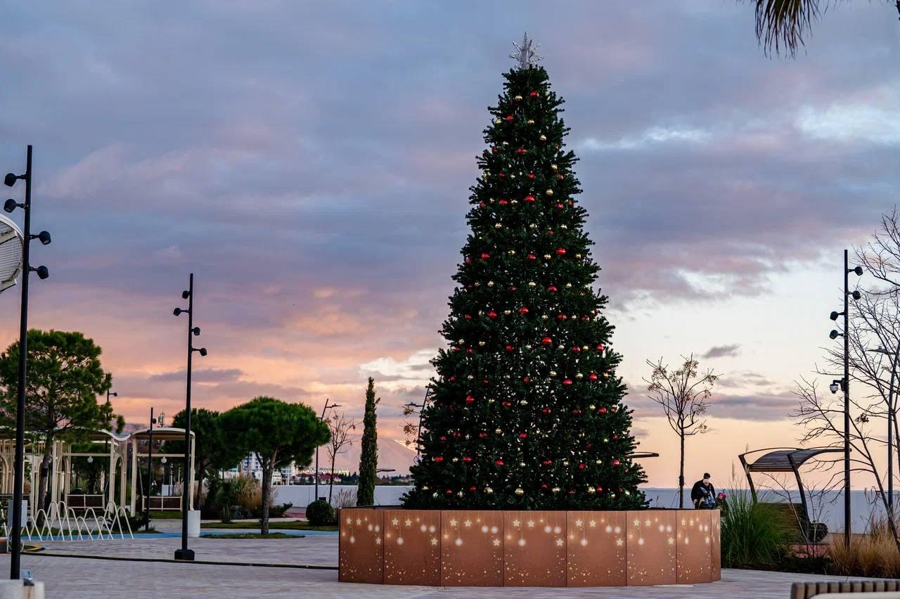 На территории Сириуса установлены несколько крупных новогодних елок.
