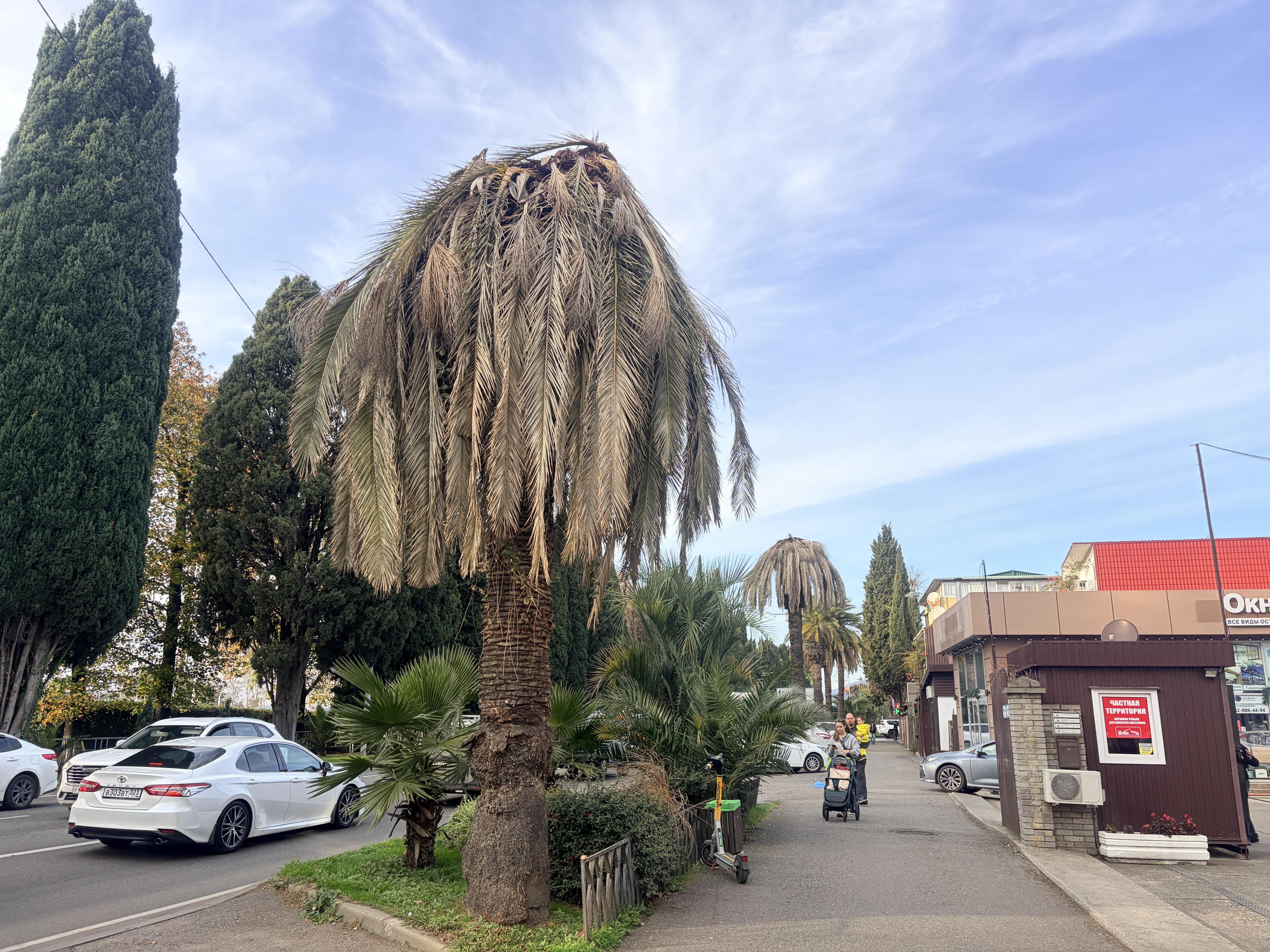 В центре Адлера на улице Ленина погибла знаменитая пальмовая аллея, которая много лет служила популярным фоном для фотографий туристов. Если еще недавно пальмы были зелеными, то теперь их крупные листья обвисли — признак того, что стволы полностью уничтожены изнутри долгоносиком. Этот вредитель размером с палец человека, но его разрушительную деятельность почти невозможно заметить визуально, пока растение не погибнет. По словам экспертов, первый сигнал — перфорация на молодых листьях — появляется примерно через три месяца после откладки личинок.