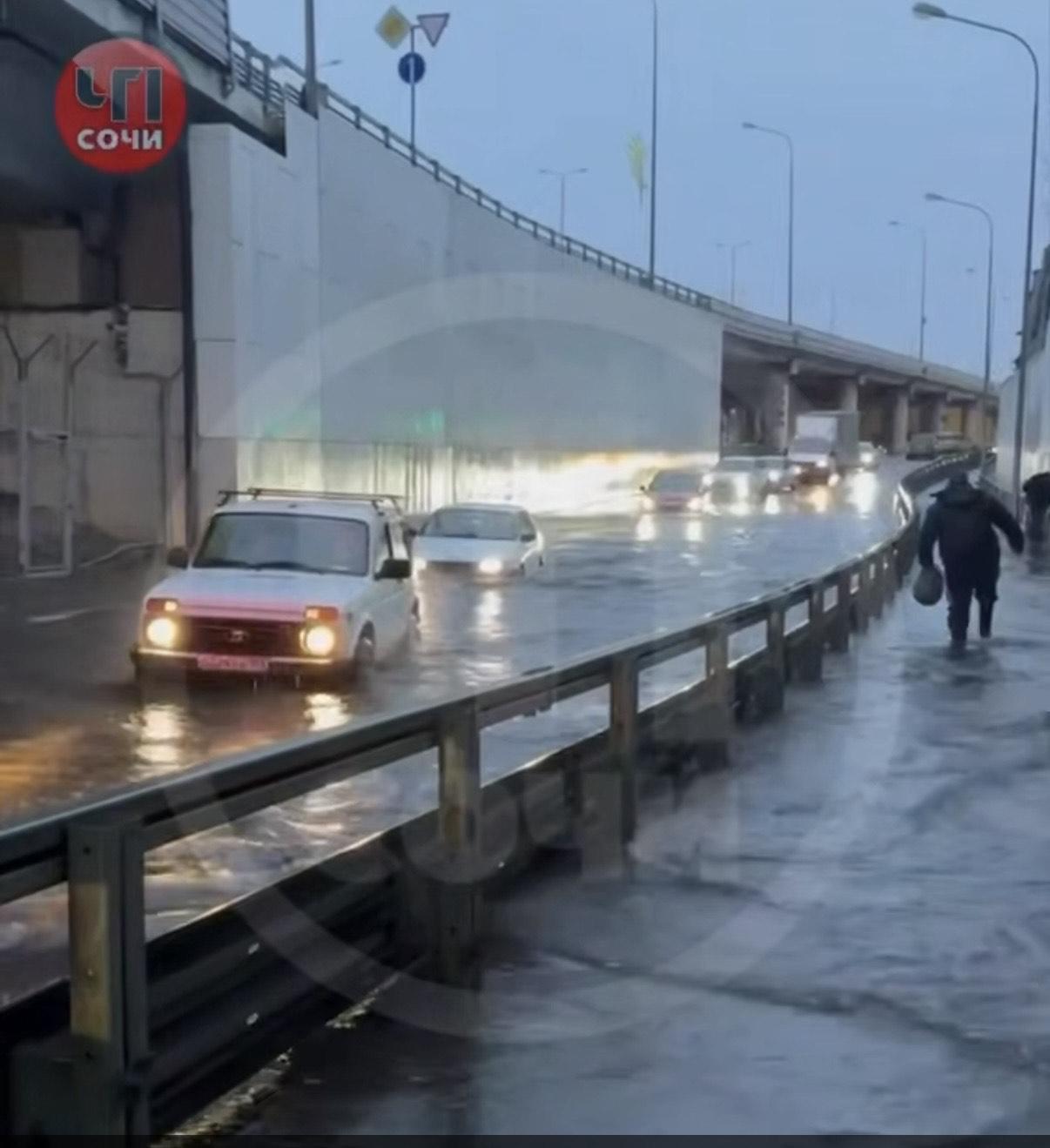 Сильный дождь затопил развязку у железнодорожного вокзала в Адлере, создав пробки и осложнив движение пешеходов.