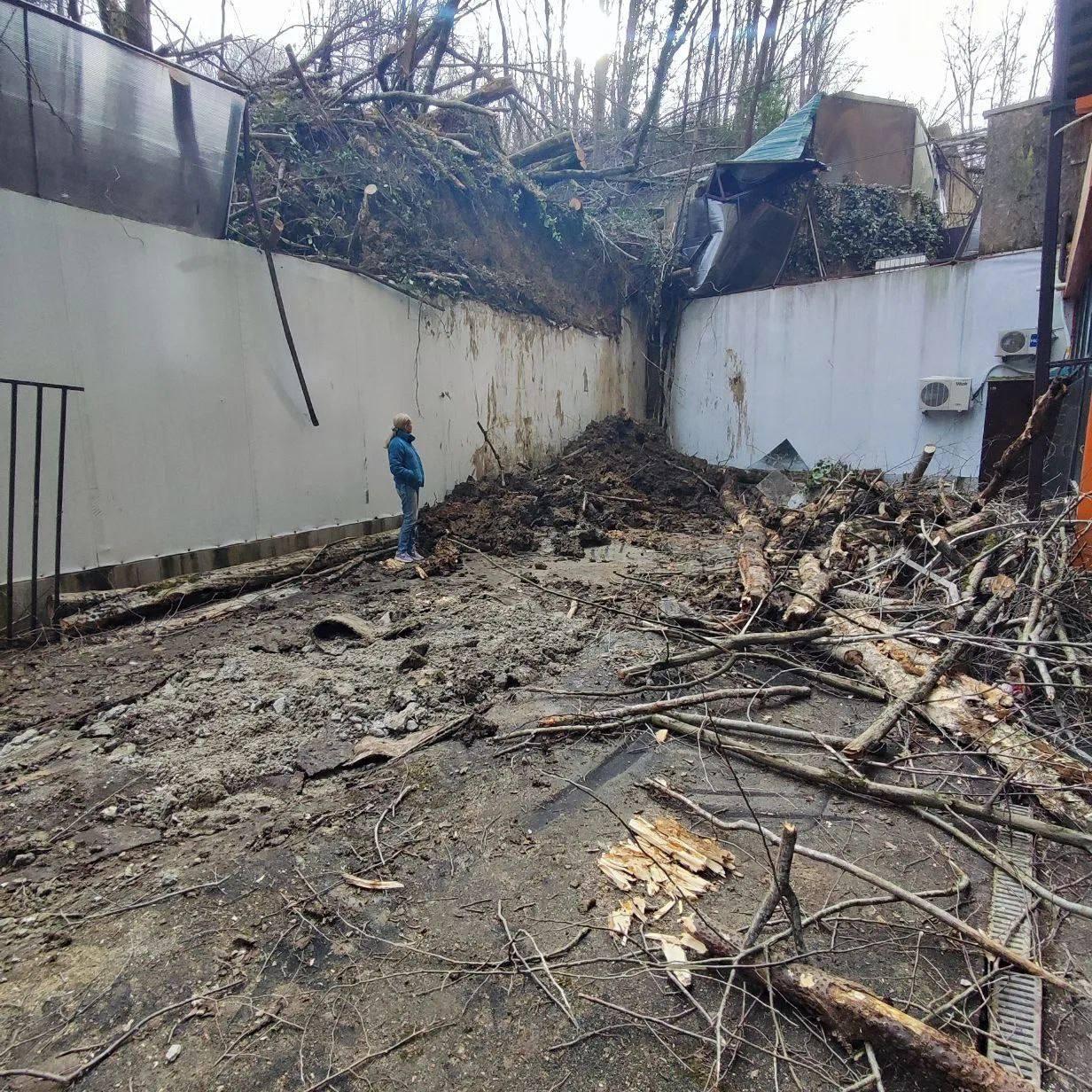 Двор завален ветками и грязью после оползня